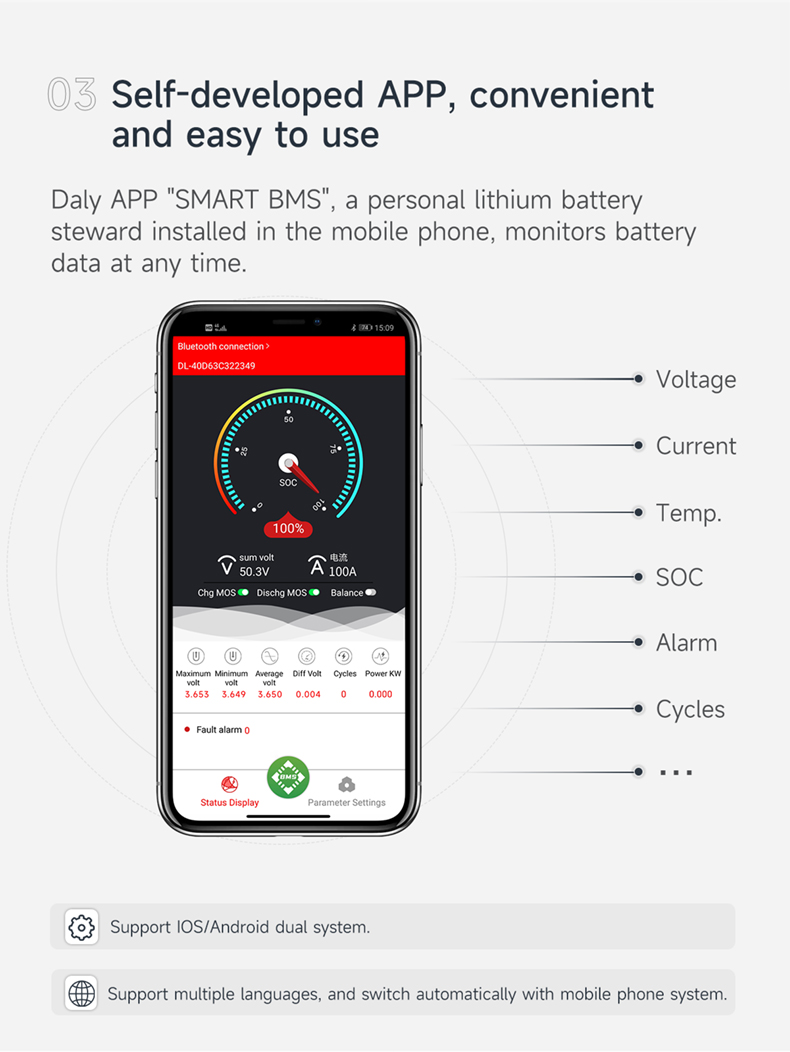 Dali BMS has three communication methods: UART/RS485/CAN, which can be connected to a PC sofeware or touch screen or mobile phone APP(bluetooth APP) to intelligently manage lithium batteries.