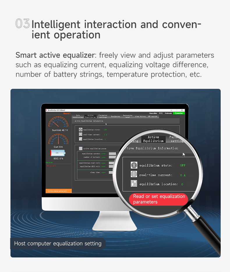 1A equalization current.Transfer the high-energy single battery to the low-energy single battery, or use thewhole group of energy to supplementthe lowest single battery.During the implementation process,the energy is redistributed through the energy storage link, so as to ensure the battery consistency to the greatest extent, improve the battery life mileage and delay the battery aging.